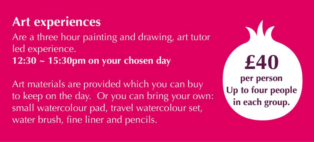 Following your art experience day you’ll have the confidence and enjoyment of making sketches and water colours on weekend breaks or just out and about. You really don’t need much equipment for painting on the go ~ and all can be fitted into a small bag.